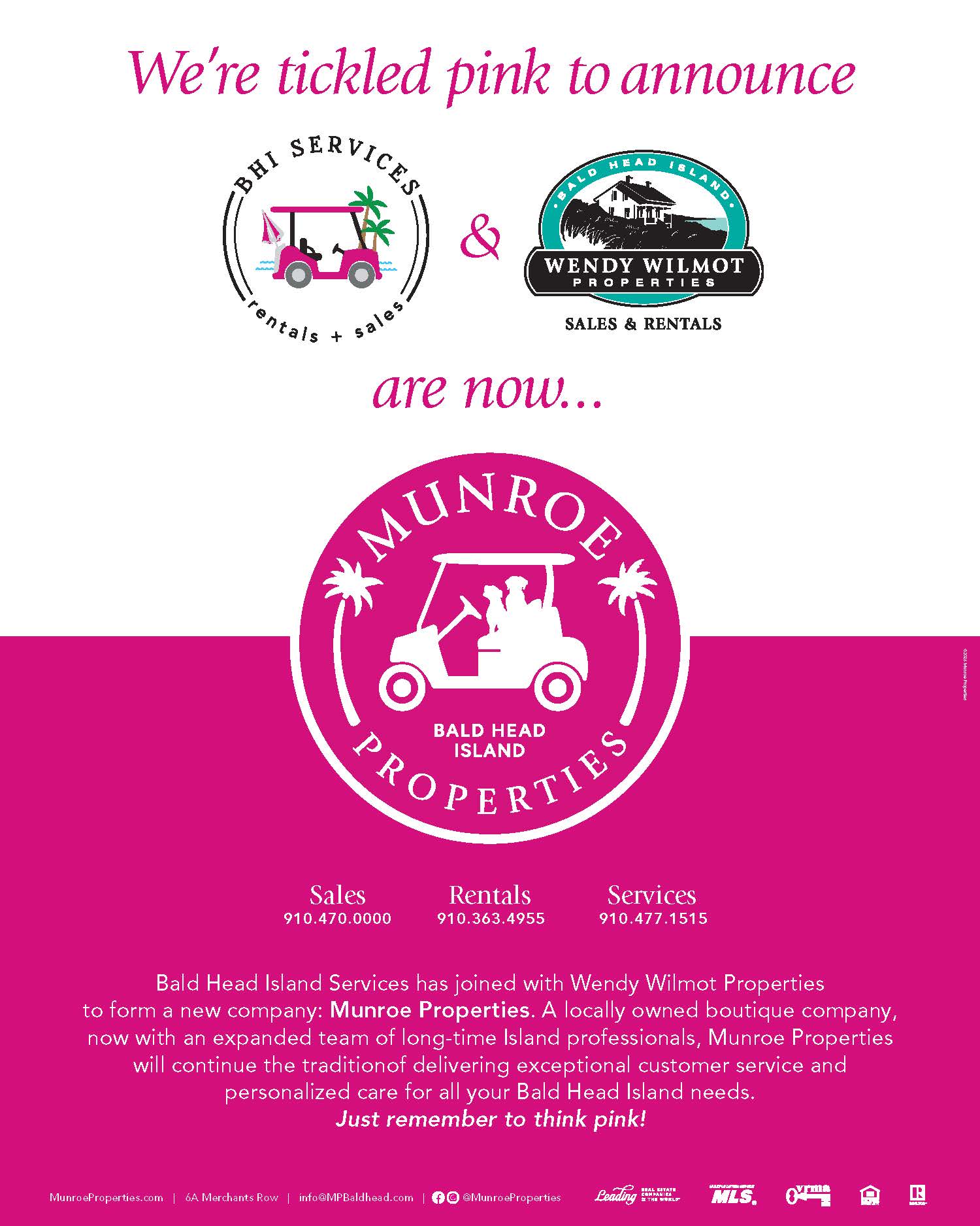 Wendy Wilmot Properties has joined with Bald Head Island Services to form a new company: Munroe Properties. A locally owned boutique company, now with an expanded team of long-time Island professionals, Munroe Properties will continue the tradition of delivering exceptional customer service and personalized care for all your Bald Head Island needs.